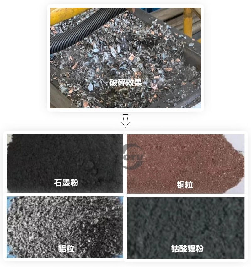 Через оборудование, такое как шнековый бункер, материал равномерно подается на вторичное дробильное оборудование для дробления до размера около 8 мм! Порошок батареи и металл удаляются через систему отрицательного давления!